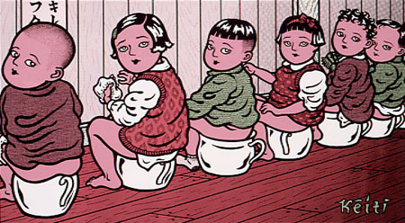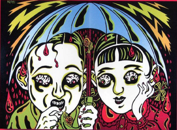 Keiti Ota es un ilustrador (y músico) japonés. Encontrar su trabajo no es labor fácil, al menos no en Occidente, al menos no valiéndose únicamente de una búsqueda en Google,al menos no únicamente hablando español e inglés (saber francés y japonés es muy útil en este caso). Afortunadamente la galería Vértigo (Colima #23-A, Col. Roma) actualmente está exhibiendo unos pósters y serigrafías hechas por este maestro. Esta es una muestra de lo que podemos ver en exposición: