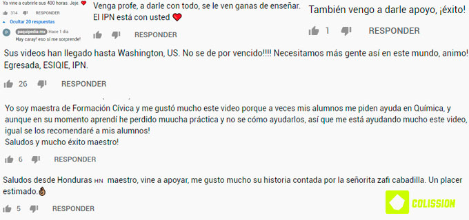 Además de las publicaciones, el canal del profesor se llenó de comentarios positivos de todo tipo. Desde algunos alumnos que agradecen y muestran su apoyo al profesor, pasando por gente que dejó los estudios y quiere ayudar al profesor a llevar su canal a monetizar el canal; hasta gente que se encuentra en otros países y busca apoyarlo también.