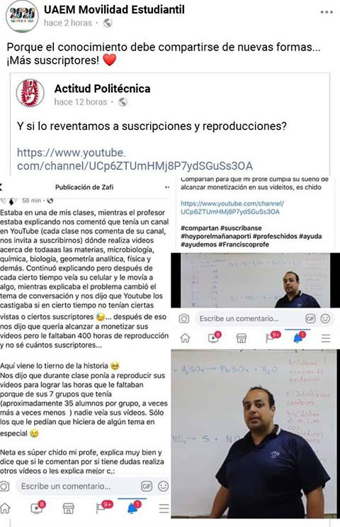 Nos dijo que durante clase ponía a reproducir sus videos para lograr las horas que le faltaban porque de sus 7 grupos que tenía (aproximadamente 35 alumnos por grupo, a veces más a veces menos ) nadie veía sus vídeos. Sólo los que le pedían que hiciera de algún tema en especial ?Neta es súper chido mi profe, explica muy bien y dice que si le comentan por si tiene dudas realiza otros vídeos o les explica mejor c,: